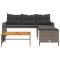 Canapé de jardin avec table et coussins en forme de L grisCe canapé de jardin en forme de L est le complément parfait de votre jardin, terrasse ou patio, offrant un espace confortable et accueillant pour discuter avec la famille et les amis ou simplement se détendre et profiter de l'extérieur. Matériau durable : la résine tressée, également connue sous le nom de poly rotin, est un matériau synthétique solide et nécessitant peu d'entretien qui ressemble au rotin naturel. Il est léger, facile à nettoyer et couramment utilisé pour les meubles d'extérieur en raison de sa durabilité et de ses propriétés de résistance aux intempéries.Expérience d'assise confortable : ce mobilier d'extérieur, doté de coussins épais, offre une expérience d'assise confortable.Housse amovible et lavable : ces coussins de siège sont dotés de housses amovibles pour un lavage et un entretien faciles. Cadre robuste et stable : le cadre en acier enduit de poudre assure la solidité et la stabilité du meuble de jardin pour une utilisation quotidienne à l'extérieur.Dessus stable et facile à nettoyer : cette table de jardin a un dessus en bois d'acacia robuste, durable et facile à nettoyer avec un chiffon humide. Bon à savoir :Pour que vos meubles d'extérieur restent beaux, nous vous recommandons de les protéger avec une housse imperméable. Maximum 110 kg par siège. Soyez conscient du risque de feux ouverts et d'autres sources de forte chaleur à proximité du produit.