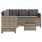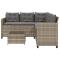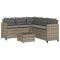 Canapé de jardin avec table et coussins en forme de L grisCe canapé de jardin en forme de L est le complément parfait de votre jardin, terrasse ou patio, offrant un espace confortable et accueillant pour discuter avec la famille et les amis ou simplement se détendre et profiter de l'extérieur. Matériau durable : la résine tressée, également connue sous le nom de poly rotin, est un matériau synthétique solide et nécessitant peu d'entretien qui ressemble au rotin naturel. Il est léger, facile à nettoyer et couramment utilisé pour les meubles d'extérieur en raison de sa durabilité et de ses propriétés de résistance aux intempéries.Expérience d'assise confortable : ce mobilier d'extérieur, doté de coussins épais, offre une expérience d'assise confortable.Dessus en verre : le dessus de la table d'extérieur est fabriqué en verre trempé solide et durable, ce qui le rend facile à nettoyer avec un chiffon humide et ajoute une touche d'élégance à votre espace extérieur.Housse amovible et lavable : ces coussins de siège sont dotés de housses amovibles pour un lavage et un entretien faciles.Cadre robuste et stable : le cadre en acier enduit de poudre assure la solidité et la stabilité du meuble de jardin pour une utilisation quotidienne à l'extérieur. Bon à savoir :Pour que vos meubles d'extérieur restent beaux, nous vous recommandons de les protéger avec une housse imperméable. Maximum 110 kg par siège. Soyez conscient du risque de feux ouverts et d'autres sources de forte chaleur à proximité du produit.