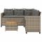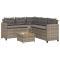 Canapé de jardin avec table et coussins en forme de L grisCe canapé de jardin en forme de L est le complément parfait de votre jardin, terrasse ou patio, offrant un espace confortable et accueillant pour discuter avec la famille et les amis ou simplement se détendre et profiter de l'extérieur. Matériau durable : la résine tressée, également connue sous le nom de poly rotin, est un matériau synthétique solide et nécessitant peu d'entretien qui ressemble au rotin naturel. Il est léger, facile à nettoyer et couramment utilisé pour les meubles d'extérieur en raison de sa durabilité et de ses propriétés de résistance aux intempéries.Expérience d'assise confortable : ce mobilier d'extérieur, doté de coussins épais, offre une expérience d'assise confortable.Dessus stable et facile à nettoyer : cette table de jardin a un dessus en bois d'acacia robuste, durable et facile à nettoyer avec un chiffon humide.Housse amovible et lavable : ces coussins de siège sont dotés de housses amovibles pour un lavage et un entretien faciles.Cadre robuste et stable : le cadre en acier enduit de poudre assure la solidité et la stabilité du meuble de jardin pour une utilisation quotidienne à l'extérieur. Bon à savoir :Pour que vos meubles d'extérieur restent beaux, nous vous recommandons de les protéger avec une housse imperméable. Maximum 110 kg par siège. Soyez conscient du risque de feux ouverts et d'autres sources de forte chaleur à proximité du produit.