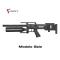 Le corps de la carabine est en aluminium pour un équilibre optimal, à l'exception de la poignée pistolet AR-15, en caoutchouc antidérapant. La Gale offre des performances élevées, contrôlées par un régulateur intégré qui garantit une précision constante en assurant un débit d'air identique dans la valve, quelle que soit la pression du réservoir. Le manomètre de pression du cylindre est situé à l'avant de la crosse, tandis que la pression du régulateur est lisible sur la détente. Bien entendu, performances élevées et longue portée ne sont possibles que si le mécanisme de détente fonctionne parfaitement. Ce fonctionnement étant propre à chaque tireur, le mécanisme de détente de la Gale est réglable sur deux niveaux, et sa hauteur est également ajustable avec précision, permettant ainsi de moduler la force nécessaire au tir.