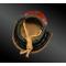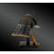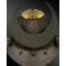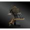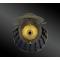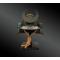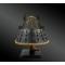 La visière (mabezashi) est en fer naturel, rivetée à trois reprises et laqué rouge au revers, les ailettes latérales (fukigayeshi) sont agrémentées de velours vert à motifs, le couvre-nuque (shikoro) est composé de quatre bandes laquées lacées de soie bleu, dont la dernière lame est brodée de ruban jaune. Enfin, l’ornement central (maedate) est en laiton finement découpé de manière à former un croissant de lune.