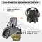 Réduction du bruit - Notre protection auditive pour le tir atteint une réduction active du bruit via le traitement des copeaux.Les cache-oreilles pour la prise de vue ont deux microphones à gain élevé qui ramèvent l'activité du son et réduit le bruit de moins de 0,01 secondes lorsque le bruit ambiant dépassé 82 dB.NRR : 22 dB.