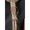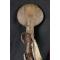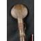 Une pierre ronde est fixée sur le manche en bois par une large lanière de cuir prolongée par des lacets de cuir le long du manche.