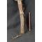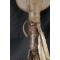 Sa décoration est très élaborée : une plume, une perle noire, une large bande de 7 lignes de petites perles rouges, deux mèches de crin de cheval fixées par des pinces métalliques et trois lacets de cuir noués.