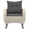 Chaise à bascule de jardin avec coussins gris clair poly rotinDétendez-vous et profitez de l'extérieur dans ce confortable chaise à bascule ! Matériau durable : la résine tressée, également connue sous le nom de poly rotin, est un matériau synthétique solide et nécessitant peu d'entretien qui ressemble au rotin naturel. Elle est légère, facile à nettoyer et couramment utilisée pour les meubles d'extérieur en raison de sa durabilité et de ses propriétés de résistance aux intempéries.Balancement apaisant et stabilité : basculez doucement d'avant en arrière sur ce siège de jardin pour une relaxation ultime. Le bas des pieds en métal du fauteuil à bascule d'extérieur est équipé d'une bande en caoutchouc pour augmenter l'adhérence et la stabilité, l'empêchant de basculer pendant l'utilisation.Expérience d'assise confortable : ce mobilier d'extérieur, doté de coussins épais, offre une expérience d'assise confortable.Housse amovible et lavable : le coussin de siège est doté d'une housse amovible pour un lavage et un entretien faciles.Cadre robuste et stable : le cadre en acier enduit de poudre assure la solidité et la stabilité du meuble de jardin pour une utilisation quotidienne à l'extérieur. Bon à savoir :Pour que vos meubles d'extérieur restent beaux, nous vous recommandons de les protéger avec une housse imperméable.