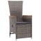 Chaise inclinable de jardin 2pc et coussins Résine tressée GrisNos élégantes chaises inclinables de jardin en résine tressée deviendront le point de mire de votre jardin ou terrasse ! Ces chaises de salle à manger au design élégant et contemporain seront un excellent choix pour manger en plein air ou vous détendre dans le jardin. Fabriquées en résine tressée résistante aux intempéries et à l'eau, les chaises d'extérieur sont faciles à nettoyer, résistantes à l'usure et adaptées à une utilisation quotidienne. Les cadres en acier enduit de poudre les rendent fortes et robustes. Les accoudoirs sont en bois d'acacia, un bois dur tropical, qui apportera un charme rustique.Grâce à la conception réglable et au mécanisme de levage à gaz, le dossier et le repose-pied peuvent être ajustés pour s'adapter à vos positions. En appuyant sur le bouton situé sur le côté, le dossier s'incline et le repose-pied se déplace en même temps, pour une position couchée confortable. Grâce à leur construction légère, les chaises de jardin sont faciles à déplacer. Les coussins de siège épais, doux et rembourrés en mousse sont très confortables et faits en polyester hydrofuge. Les housses des coussins avec fermetures éclair peuvent être facilement enlevées et lavées. Remarque : nous vous recommandons de couvrir l'ensemble pendant la pluie, la neige et le gel. Maximum 110 kg par siège. Soyez conscient du risque de feux ouverts et d'autres sources de forte chaleur à proximité du produit. ,