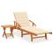 Chaise longue de jardin avec table et coussin Bois d'acaciaAvec cette chaise longue en bois d'acacia massif à la mode, vous trouverez toujours un endroit confortable pour vous détendre sur votre terrasse ou dans votre jardin. Cette chaise longue de jardin et la table sont fabriquées en bois d'acacia massif, ce qui les rend robustes et stables. La chaise longue de jardin peut être facilement déplacée autour de la maison grâce aux 2 roues. Le dossier et le repose-pied sont réglables, et vous pouvez également verrouiller la chaise longue en bois dans la position souhaitée. La table coulissante et la table latérale pliable vous permettent de placer votre téléphone, lunettes de soleil, boisson et autres petits articles. Le coussin ajoute un confort supplémentaire tout en vous prélassant. Chaque coussin comprend deux jeux de cordes pour le fixer fermement sur le transat. Maximum 110 kg par siège. ,