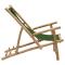 Chaise de terrasse Bambou et toile VertCette chaise de terrasse en bambou réglable en hauteur avec accoudoirs est conçue pour être un supplément fabuleux à votre jardin, patio ou terrasse. Matériau de première qualité : la toile est un tissu uni largement utilisé, connu pour sa robustesse, sa résistance à l'eau, sa légèreté et son utilisation intensive. De plus, il a un tissage plus serré que la plupart des tissus tissés, ce qui le rend plus rigide et durable.Cadre stable : le cadre de la chaise est fabriqué en bambou , qui est extrêmement durable. Le matériau ne change pas de couleur pendant longtemps et empêche la chaise de plage de se fissurer et de se déformer.Design pliable : la chaise longue peut être pliée pour économiser de l'espace lorsqu'elle n'est pas utilisée.Dossier réglable : grâce au dossier réglable, la chaise de jardin en bambou peut être ajustée en 3 positions. Par conséquent, vous pouvez profiter d'un confort maximal. Remarque :Afin de prolonger la durée de vie de votre mobilier d'extérieur, nous vous recommandons de le protéger avec une housse imperméable. Maximum 110 kg par siège.
