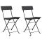 Chaises de bistrot pliantes lot de 2 Noir Résine tressée acierCes chaises de bistrot pliantes sont un complément parfait à votre jardin et à votre terrasse, créant une impression durable ! Matériau durable : la résine tressée, également connue sous le nom de rotin poly, résiste aux intempéries et est facile à nettoyer. Elle reste belle à l'extérieur pendant une longue période. Elle est plus économique que d'autres matériaux, tout en offrant une excellente qualité, une commodité et un aspect esthétique. Cadre stable : le cadre en acier enduit de poudre assure la robustesse et la stabilité. Design pliable : les chaises peuvent être facilement repliées lorsqu'elles ne sont pas utilisées pour faciliter le rangement et le transport. Remarque : Afin de prolonger la durée de vie de votre mobilier d'extérieur, nous vous recommandons de le protéger avec une housse imperméable. Chaque produit est livré avec un manuel de montage dans la boîte pour un montage facile. Maximum 110 kg par siège. ,
