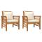 Chaises de canapé et coussins blanc crème lot de 2 Bois acaciaLes chaises en bois massif ajoutent un charme rustique et sont destinés à être un complément parfait à votre espace de vie extérieur. Bois massif de qualité supérieure : ces chaises sont fabriquées en bois d'acacia. Le bois d'acacia massif est un beau matériau naturel. Il est un bois dur tropical, dense, robuste et durable.Design confortable : les dossiers et les accoudoirs légèrement incurvés ajoutent un confort d'assise supplémentaire aux chaises.Coussins et oreillers confortables : les coussins et les oreillers bien rembourrés et amovibles offrent un confort optimal pendant votre temps d'assise en plein air. Remarque :Afin de prolonger la durée de vie de votre mobilier d'extérieur, nous vous recommandons de le protéger avec une housse imperméable.