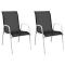 Chaises empilables de jardin lot de 2 Acier et textilène NoirCet ensemble contemporain de chaises empilables est conçu pour attirer l'attention dans votre jardin, votre salle à manger ou votre patio. Les fauteuils confortables ont une construction en acier enduit de poudre, ce qui les rend robustes et stables. Grâce au tissu textilène, ces chaises d'extérieur sont résistantes aux intempéries et faciles à nettoyer. Les chaises peuvent également être empilées pour économiser de l'espace lorsqu'elles ne sont pas utilisées. Détendez-vous et faites une pause tout en profitant de l'extérieur sur ces chaises de salle à manger confortables et durables ! Maximum 110 kg par siège.