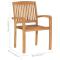 Chaises empilables à manger de jardin lot de 2 Bois teck solideAjoutez une touche de charme rustique à votre salle à manger, jardin ou terrasse avec nos chaises de salle à manger empilables intelligemment conçues ! Robuste et stable : le bois de teck massif est un matériau naturel magnifique. Il a été chevronné, séché au four, puis sablé finement pour lui donner une apparence très lisse. Le bois de teck est connu pour sa résistance exceptionnelle et sa résistance aux intempéries.Facile à entretenir : grâce à sa surface lisse, le banc en bois se nettoie facilement à l'aide d'un chiffon humide et nécessite peu d'entretien.Conception pratique : ces chaises de salle à manger peuvent être facilement pliées lorsqu'elles ne sont pas utilisées et ne prendront pas trop de place. Bon à savoir :Pour que vos meubles d'extérieur restent beaux, nous vous recommandons de les protéger avec une housse imperméable. Maximum 110 kg par siège.