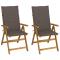 Chaises inclinables de jardin lot de 2 et coussins Bois acaciaCet ensemble de chaises de jardin inclinables en bois avec coussins est conçu pour améliorer votre niveau de confort tout en vous relaxant à l'extérieur. Il est idéal pour discuter en famille et entre amis ou tout simplement profiter des bains de soleil apaisants ! Ces chaises d'extérieur sont en bois d'acacia massif avec une finition à l'huile, un bois dur aux grains denses. Le bois d'acacia massif a la force de soutenir le poids et de résister à l'usure du temps. Avec la surface finie à l'huile, ces chaises sont faciles à nettoyer avec un chiffon humide. De plus, les dossiers de ces fauteuils sont réglables en 5 positions d'inclinaison, vous permettant de toujours trouver la position la plus agréable. De plus, les coussins fournis offrent un confort supplémentaire lors de la détente ou du dîner. Chaque coussin a une bande élastique et deux jeux de cordes pour le fixer fermement sur la chaise. Maximum 110 kg par siège. ,