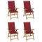 Chaises inclinables de jardin lot de 4 et coussins Bois acaciaCet ensemble de chaises de jardin inclinables en bois avec coussins est conçu pour améliorer votre niveau de confort tout en vous relaxant à l'extérieur. Il est idéal pour discuter en famille et entre amis ou tout simplement profiter des bains de soleil apaisants ! Ces chaises d'extérieur sont en bois d'acacia massif avec une finition à l'huile, un bois dur aux grains denses. Le bois d'acacia massif a la force de soutenir le poids et de résister à l'usure du temps. Avec la surface finie à l'huile, ces chaises sont faciles à nettoyer avec un chiffon humide. De plus, les dossiers de ces fauteuils sont réglables en 5 positions d'inclinaison, vous permettant de toujours trouver la position la plus agréable. De plus, les coussins fournis offrent un confort supplémentaire lors de la détente ou du dîner. Chaque coussin a une bande élastique et deux jeux de cordes pour le fixer fermement sur la chaise. Maximum 110 kg par siège. ,