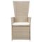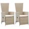 Chaises inclinables lot de 2 et coussins Résine tressée BeigeNos élégantes chaises inclinables de jardin en résine tressée deviendront le point de mire de votre jardin ou terrasse ! Ces chaises de salle à manger au design élégant et contemporain seront un excellent choix pour manger en plein air ou vous détendre dans le jardin. Fabriquées en résine tressée résistante aux intempéries et à l'eau, les chaises d'extérieur sont faciles à nettoyer, résistantes à l'usure et adaptées à une utilisation quotidienne. Les cadres en acier enduit de poudre les rendent fortes et robustes. Grâce à la conception réglable et au mécanisme de levage à gaz, le dossier et le repose-pied peuvent être ajustés pour s'adapter à vos positions. En appuyant sur le bouton situé sur le côté, le dossier s'incline et le repose-pied se déplace en même temps, pour une position couchée confortable. Grâce à leur construction légère, les chaises inclinables de jardin sont faciles à déplacer. Les coussins de siège épais, doux et rembourrés en mousse sont très confortables et faits en polyester hydrofuge. Les housses des coussins avec fermetures éclair peuvent être facilement enlevées et lavées. Remarque : nous vous recommandons de couvrir l'ensemble pendant la pluie, la neige et le gel. Maximum 110 kg par siège. Soyez conscient du risque de feux ouverts et d'autres sources de forte chaleur à proximité du produit. ,