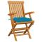 Chaises de jardin avec coussins bleu clair lot de 3 Teck massifCet ensemble de chaises de jardin en bois se compose de 3 pièces et est destiné à être un excellent supplément à votre jardin, terrasse ou patio. Vous pouvez vous détendre et discuter avec la famille et les amis ou profiter du bon temps. Fabriquée en bois dur de teck extrêmement durable, cette pièce de meuble en teck a été chevronnée, séchée au four puis finement poncée pour lui donner un aspect très lisse. Le bois de teck est connu pour sa résistance exceptionnelle aux intempéries, ce qui le rend bien plus adapté aux meubles de jardin que tout autre type de bois. Le bois de teck est le choix idéal si vous souhaitez acheter une pièce de meubles de jardin durable. La surface poncée est facile à nettoyer avec un chiffon humide. Ces chaises d'extérieur sont également légères, ce qui les rend complètement flexibles et faciles à déplacer. Les chaises en bois peuvent être pliées pour gagner de la place lorsqu'elles ne sont pas utilisées. De plus, les coussins de siège inclus bien rembourrés offrent également un confort d'assise supplémentaire. Maximum 110 kg par siège.