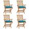 Chaises de jardin avec coussins bleu clair lot de 4 Teck massifCet ensemble de chaises de jardin en bois se compose de 4 pièces et est destiné à être un excellent supplément à votre jardin, terrasse ou patio. Vous pouvez vous détendre et discuter avec la famille et les amis ou profiter du bon temps. Fabriquée en bois dur de teck extrêmement durable, cette pièce de meuble en teck a été chevronnée, séchée au four puis finement poncée pour lui donner un aspect très lisse. Le bois de teck est connu pour sa résistance exceptionnelle aux intempéries, ce qui le rend bien plus adapté aux meubles de jardin que tout autre type de bois. Le bois de teck est le choix idéal si vous souhaitez acheter une pièce de meubles de jardin durable. La surface poncée est facile à nettoyer avec un chiffon humide. Ces chaises d'extérieur sont également légères, ce qui les rend complètement flexibles et faciles à déplacer. Les chaises en bois peuvent être pliées pour gagner de la place lorsqu'elles ne sont pas utilisées. De plus, les coussins de siège inclus bien rembourrés offrent également un confort d'assise supplémentaire. Maximum 110 kg par siège.
