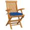 Chaises de jardin avec coussins bleu lot de 3 Bois teck massifCet ensemble de chaises de jardin en bois se compose de 3 pièces et est destiné à être un excellent supplément à votre jardin, terrasse ou patio. Vous pouvez vous détendre et discuter avec la famille et les amis ou profiter du bon temps. Fabriquée en bois dur de teck extrêmement durable, cette pièce de meuble en teck a été chevronnée, séchée au four puis finement poncée pour lui donner un aspect très lisse. Le bois de teck est connu pour sa résistance exceptionnelle aux intempéries, ce qui le rend bien plus adapté aux meubles de jardin que tout autre type de bois. Le bois de teck est le choix idéal si vous souhaitez acheter une pièce de meubles de jardin durable. La surface poncée est facile à nettoyer avec un chiffon humide. Ces chaises d'extérieur sont également légères, ce qui les rend complètement flexibles et faciles à déplacer. Les chaises en bois peuvent être pliées pour gagner de la place lorsqu'elles ne sont pas utilisées. De plus, les coussins de siège inclus bien rembourrés offrent également un confort d'assise supplémentaire. Maximum 110 kg par siège. ,
