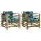 Chaises de jardin avec coussins lot de 2 bois de pin imprégnéCes chaises de jardin en bois, qui se démarquent par leur design à lattes et leurs coussins moelleux, seront un excellent supplément à votre jardin, patio ou terrasse pour profiter d'un moment agréable avec votre famille ou vos amis. Bois imprégné : le bois de pin massif est un matériau naturel magnifique. Le bois de pin a un grain droit et les noeuds lui confèrent un aspect rustique caractéristique. L'imprégnation est un processus de conservation réalisé à l'aide d'autoclaves. Le traitement sous pression augmente la résistance à la pourriture et aux intempéries. Cadre robuste et stable : le cadre en bois rend la chaise longue robuste et stable pour une utilisation quotidienne à l'extérieur. Expérience d'assise confortable : le dossier et l'accoudoir ajoutent un confort d'assise supplémentaire à la chaise d'extérieur. De plus, le coussin bien rembourré assure le confort de l'assise. Conception modulaire : la chaise de patio est flexible et facile à déplacer. Vous pouvez la combiner avec d'autres segments modulaires dans la boutique en ligne pour créer vos propres configurations d'ensemble de salon de jardin ! Bon à savoir : Pour que vos meubles d'extérieur restent beaux, nous vous recommandons de les protéger avec une housse imperméable. Maximum 110 kg par siège. ,