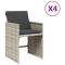 Chaises de jardin avec coussins lot de 4 gris clair poly rotinDétendez-vous et profitez de l'extérieur dans ces confortables chaises de jardin ! Matériau durable : la résine tressée, également connue sous le nom de poly rotin, est un matériau synthétique solide et nécessitant peu d'entretien qui ressemble au rotin naturel. Il est léger, facile à nettoyer et couramment utilisé pour les meubles d'extérieur en raison de sa durabilité et de ses propriétés de résistance aux intempéries. Expérience d'assise confortable : ce mobilier d'extérieur, doté de coussins épais, offre une expérience d'assise confortable. Dossier rabattable : ces chaises sont dotées d'un dossier à rabat qui peut être rabattu pour un rangement compact. Housse amovible et lavable : ces coussins sont dotés de housses amovibles pour un lavage et un entretien faciles. Les housses de coussin de chaise ont un rabat à l'arrière pour une fixation facile aux chaises. Cadre robuste et stable : le cadre en acier enduit de poudre assure la solidité et la stabilité du meuble de jardin pour une utilisation quotidienne à l'extérieur. Bon à savoir : Pour que vos meubles d'extérieur restent beaux, nous vous recommandons de les protéger avec une housse imperméable. Maximum 110 kg par siège. ,
