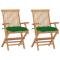 Chaises de jardin avec coussins vert lot de 2 Bois teck massifCet ensemble de chaises de jardin en bois se compose de 2 pièces et est destiné à être un excellent supplément à votre jardin, terrasse ou patio. Vous pouvez vous détendre et discuter avec la famille et les amis ou profiter du bon temps. Fabriquée en bois dur de teck extrêmement durable, cette pièce de meuble en teck a été chevronnée, séchée au four puis finement poncée pour lui donner un aspect très lisse. Le bois de teck est connu pour sa résistance exceptionnelle aux intempéries, ce qui le rend bien plus adapté aux meubles de jardin que tout autre type de bois. Le bois de teck est le choix idéal si vous souhaitez acheter une pièce de meubles de jardin durable. La surface poncée est facile à nettoyer avec un chiffon humide. Ces chaises d'extérieur sont également légères, ce qui les rend complètement flexibles et faciles à déplacer. Les chaises en bois peuvent être pliées pour gagner de la place lorsqu'elles ne sont pas utilisées. De plus, les coussins de siège inclus bien rembourrés offrent également un confort d'assise supplémentaire. Maximum 110 kg par siège.