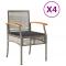 Chaises de jardin coussins lot de 4 gris résine tressée acaciaDétendez-vous et profitez de l'extérieur dans ces confortables chaises de jardin ! Matériau durable : la résine tressée, également connue sous le nom de poly rotin, est un matériau synthétique solide et nécessitant peu d'entretien qui ressemble au rotin naturel. Il est léger, facile à nettoyer et couramment utilisé pour les meubles d'extérieur en raison de sa durabilité et de ses propriétés de résistance aux intempéries.Expérience d'assise confortable : ce mobilier d'extérieur, doté de coussins épais, offre une expérience d'assise confortable.Housse amovible et lavable : ces coussins de siège sont dotés de housses amovibles pour un lavage et un entretien faciles.Cadre robuste et stable : le cadre en acier enduit de poudre assure la solidité et la stabilité du meuble de jardin pour une utilisation quotidienne à l'extérieur. Bon à savoir :Pour que vos meubles d'extérieur restent beaux, nous vous recommandons de les protéger avec une housse imperméable. Maximum 110 kg par siège.