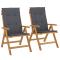 Chaises de jardin inclinables lot de 2 et coussins teck massifAméliorez le confort de votre espace extérieur avec ces chaises de jardin en bois classiques. Elles sont idéales pour discuter en famille et entre amis ou simplement pour profiter du bain de soleil ! Bois de teck massif : le bois de teck massif est un matériau naturel magnifique. Il a été chevronné, séché au four, puis sablé finement pour lui donner une apparence très lisse. Le bois de teck est connu pour sa résistance exceptionnelle et sa résistance aux intempéries.Dossier réglable : les dossiers des chaises de jardin sont réglables en 6 positions afin que vous puissiez toujours trouver la position la plus confortable.Fonction pliable : la chaise de jardin est pliable, ce qui vous permet de la replier pour gagner de la place lorsque vous ne l'utilisez pas.Assise confortable : la chaise d'extérieur, avec son assise à lattes, ses accoudoirs et son dossier incurvés, s'adapte à votre corps et vous offre un confort optimal. De plus, le coussin moelleux offre un confort d'assise optimal.Coussin antidérapant : des cordes bien conçues et une sangle arrière élastique permettent de fixer facilement le coussin à la chaise et de le maintenir proprement et en toute sécurité. Bon à savoir :Pour que vos meubles d'extérieur restent beaux, nous vous recommandons de les protéger avec une housse imperméable. Maximum 110 kg par siège.