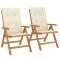 Chaises de jardin inclinables lot de 2 et coussins teck massifAméliorez le confort de votre espace extérieur avec ces chaises de jardin en bois classiques. Elles sont idéales pour discuter en famille et entre amis ou simplement pour profiter du bain de soleil ! Bois de teck massif : le bois de teck massif est un matériau naturel magnifique. Il a été chevronné, séché au four, puis sablé finement pour lui donner une apparence très lisse. Le bois de teck est connu pour sa résistance exceptionnelle et sa résistance aux intempéries.Dossier réglable : les dossiers des chaises de jardin sont réglables en 6 positions afin que vous puissiez toujours trouver la position la plus confortable.Fonction pliable : la chaise de jardin est pliable, ce qui vous permet de la replier pour gagner de la place lorsque vous ne l'utilisez pas.Assise confortable : la chaise d'extérieur, avec son assise à lattes, ses accoudoirs et son dossier incurvés, s'adapte à votre corps et vous offre un confort optimal. De plus, le coussin moelleux offre un confort d'assise optimal.Coussin antidérapant : des cordes bien conçues et une sangle arrière élastique permettent de fixer facilement le coussin à la chaise et de le maintenir proprement et en toute sécurité. Bon à savoir :Pour que vos meubles d'extérieur restent beaux, nous vous recommandons de les protéger avec une housse imperméable. Maximum 110 kg par siège.