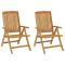 Chaises de jardin inclinables lot de 2 et coussins teck massifAméliorez le confort de votre espace extérieur avec ces chaises de jardin en bois classiques. Elles sont idéales pour discuter en famille et entre amis ou simplement pour profiter du bain de soleil ! Bois de teck massif : le bois de teck massif est un matériau naturel magnifique. Il a été chevronné, séché au four, puis sablé finement pour lui donner une apparence très lisse. Le bois de teck est connu pour sa résistance exceptionnelle et sa résistance aux intempéries. Dossier réglable : les dossiers des chaises de jardin sont réglables en 6 positions afin que vous puissiez toujours trouver la position la plus confortable. Fonction pliable : la chaise de jardin est pliable, ce qui vous permet de la replier pour gagner de la place lorsque vous ne l'utilisez pas. Assise confortable : la chaise d'extérieur, avec son assise à lattes, ses accoudoirs et son dossier incurvés, s'adapte à votre corps et vous offre un confort optimal. De plus, le coussin moelleux offre un confort d'assise optimal. Coussin antidérapant : des cordes bien conçues et une sangle arrière élastique permettent de fixer facilement le coussin à la chaise et de le maintenir proprement et en toute sécurité. Bon à savoir : Pour que vos meubles d'extérieur restent beaux, nous vous recommandons de les protéger avec une housse imperméable. Maximum 110 kg par siège. ,