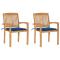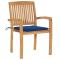 Chaises de jardin lot de 2 avec coussins bleu royal Teck massifCes chaises de jardin en bois ajoutent un aspect vintage à votre jardin, patio ou tout autre espace de vie extérieur. Fabriquée en bois dur de teck extrêmement durable, cette pièce de meuble en teck a été chevronnée, séchée au four puis finement poncée pour lui donner un aspect très lisse. Le bois de teck est connu pour sa résistance exceptionnelle aux intempéries, ce qui le rend bien plus adapté aux meubles de jardin que tout autre type de bois. Le bois de teck est le choix idéal si vous souhaitez acheter un meuble de jardin durable. L'ensemble de chaises d'extérieur comprend des dossiers à lattes et des accoudoirs légèrement incurvés, offrant un confort d'assise supplémentaire. Elles sont également empilables pour économiser de l'espace lorsqu'elles ne sont pas utilisées. Les coussins inclus sont pratiques et ont une fonction décorative. Maximum 110 kg par siège.