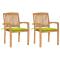 Chaises de jardin lot de 2 avec coussins vert vif Teck massifCes chaises de jardin en bois ajoutent un aspect vintage à votre jardin, patio ou tout autre espace de vie extérieur. Fabriquée en bois dur de teck extrêmement durable, cette pièce de meuble en teck a été chevronnée, séchée au four puis finement poncée pour lui donner un aspect très lisse. Le bois de teck est connu pour sa résistance exceptionnelle aux intempéries, ce qui le rend bien plus adapté aux meubles de jardin que tout autre type de bois. Le bois de teck est le choix idéal si vous souhaitez acheter un meuble de jardin durable. L'ensemble de chaises d'extérieur comprend des dossiers à lattes et des accoudoirs légèrement incurvés, offrant un confort d'assise supplémentaire. Elles sont également empilables pour économiser de l'espace lorsqu'elles ne sont pas utilisées. Les coussins inclus sont pratiques et ont une fonction décorative. Maximum 110 kg par siège. ,