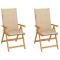 Chaises de jardin lot de 2 et coussins beige Bois teck massifCet ensemble de chaises de jardin en bois est un excellent supplément à votre jardin ou patio. Il est idéal pour vous détendre, discuter avec la famille et les amis ou tout simplement profiter du bon temps. Fabriquée en bois dur de teck extrêmement durable, cette pièce de meuble en teck a été chevronnée, séchée au four puis finement poncée pour lui donner un aspect très lisse. Le bois de teck est connu pour sa résistance exceptionnelle aux intempéries, ce qui le rend bien plus adapté aux meubles de jardin que tout autre type de bois. Le bois de teck est le choix idéal si vous souhaitez acheter une pièce de meubles de jardin durable. Le dossier de la chaise peut être ajusté sur 7 niveaux d'inclinaison, de sorte que vous puissiez toujours trouver la position la plus confortable. La chaise est également légère, ce qui la rend facile à déplacer. La chaise d'extérieur peut également être pliée pour gagner de la place lorsqu'elle n'est pas utilisée. Le coussin inclus est plus qu'un supplément pratique; il a également une fonction décorative. Maximum 110 kg par siège.