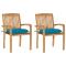 Chaises de jardin lot de 2 et coussins bleu clair Bois de teckCes chaises de jardin en bois ajoutent un aspect vintage à votre jardin, patio ou tout autre espace de vie extérieur. Fabriquée en bois dur de teck extrêmement durable, cette pièce de meuble en teck a été chevronnée, séchée au four puis finement poncée pour lui donner un aspect très lisse. Le bois de teck est connu pour sa résistance exceptionnelle aux intempéries, ce qui le rend bien plus adapté aux meubles de jardin que tout autre type de bois. Le bois de teck est le choix idéal si vous souhaitez acheter un meuble de jardin durable. L'ensemble de chaises d'extérieur comprend des dossiers à lattes et des accoudoirs légèrement incurvés, offrant un confort d'assise supplémentaire. Elles sont également empilables pour économiser de l'espace lorsqu'elles ne sont pas utilisées. Les coussins inclus sont pratiques et ont une fonction décorative. Maximum 110 kg par siège.