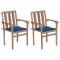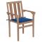 Chaises de jardin lot de 2 et coussins bleu royal Bois de teckCet élégant ensemble de 2 chaises de jardin en bois présente un design intemporel. Les chaises d'extérieur conviennent à tous les environnements, tels que les maisons, les bureaux, les bars et les cafés, grâce à leur design simple mais élégant. Fabriquée en bois dur de teck extrêmement durable, cette pièce de meuble en teck a été chevronnée, séchée au four puis finement poncée pour lui donner un aspect très lisse. Le bois de teck est connu pour sa résistance exceptionnelle aux intempéries, ce qui le rend bien plus adapté aux meubles de jardin que tout autre type de bois. Le bois de teck est le choix idéal si vous souhaitez acheter un meuble de jardin durable. Ces chaises de patio sont empilables pour économiser de l'espace de rangement lorsqu'elles ne sont pas utilisées. Le produit est appliqué avec une belle finition pour donner au bois une couleur chaude. Les coussins d'assise inclus offrent également un confort supplémentaire. Maximum 110 kg par siège.