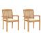 Chaises de jardin lot de 2 et coussins crème Bois teck massifCes chaises de jardin en bois ajoutent un aspect vintage à votre jardin, patio ou tout autre espace de vie extérieur. Fabriquée en bois dur de teck extrêmement durable, cette pièce de meuble en teck a été chevronnée, séchée au four puis finement poncée pour lui donner un aspect très lisse. Le bois de teck est connu pour sa résistance exceptionnelle aux intempéries, ce qui le rend bien plus adapté aux meubles de jardin que tout autre type de bois. Le bois de teck est le choix idéal si vous souhaitez acheter un meuble de jardin durable. L'ensemble de chaises d'extérieur comprend des dossiers à lattes et des accoudoirs légèrement incurvés, offrant un confort d'assise supplémentaire. Elles sont également empilables pour économiser de l'espace lorsqu'elles ne sont pas utilisées. Les coussins inclus sont pratiques et ont une fonction décorative. Maximum 110 kg par siège.