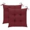 Chaises de jardin lot de 2 coussins rouge bordeaux Teck massifCet élégant ensemble de 2 chaises de jardin en bois présente un design intemporel. Les chaises d'extérieur conviennent à tous les environnements, tels que les maisons, les bureaux, les bars et les cafés, grâce à leur design simple mais élégant. Fabriquée en bois dur de teck extrêmement durable, cette pièce de meuble en teck a été chevronnée, séchée au four puis finement poncée pour lui donner un aspect très lisse. Le bois de teck est connu pour sa résistance exceptionnelle aux intempéries, ce qui le rend bien plus adapté aux meubles de jardin que tout autre type de bois. Le bois de teck est le choix idéal si vous souhaitez acheter un meuble de jardin durable. Ces chaises de patio peuvent être pliées pour économiser de l'espace de rangement lorsqu'elles ne sont pas utilisées. Les coussins d'assise bien rembourrés, le siège incurvé et le dossier offrent également un confort supplémentaire. Maximum 110 kg par siège.