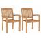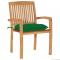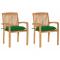 Chaises de jardin lot de 2 et coussins vert Bois de teck massifCes chaises de jardin en bois ajoutent un aspect vintage à votre jardin, patio ou tout autre espace de vie extérieur. Fabriquée en bois dur de teck extrêmement durable, cette pièce de meuble en teck a été chevronnée, séchée au four puis finement poncée pour lui donner un aspect très lisse. Le bois de teck est connu pour sa résistance exceptionnelle aux intempéries, ce qui le rend bien plus adapté aux meubles de jardin que tout autre type de bois. Le bois de teck est le choix idéal si vous souhaitez acheter un meuble de jardin durable. L'ensemble de chaises d'extérieur comprend des dossiers à lattes et des accoudoirs légèrement incurvés, offrant un confort d'assise supplémentaire. Elles sont également empilables pour économiser de l'espace lorsqu'elles ne sont pas utilisées. Les coussins inclus sont pratiques et ont une fonction décorative. Maximum 110 kg par siège.