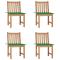 Chaises de jardin lot de 4 avec coussins Bois de teck massifCet ensemble de chaises de jardin en bois robuste sera un endroit idéal pour vous détendre et profiter du soleil dans votre jardin ou patio. Fabriquée en bois dur de teck extrêmement durable, cette pièce de meuble en teck a été chevronnée, séchée au four puis finement poncée pour lui donner un aspect très lisse. Le bois de teck est connu pour sa résistance exceptionnelle aux intempéries, ce qui le rend bien plus adapté aux meubles de jardin que tout autre type de bois. Le bois de teck est le choix idéal si vous souhaitez acheter un meuble de jardin durable. Une belle finition à base d'eau est appliquée pour donner au bois une couleur chaude. Les chaises d'extérieur stables disposent d'un aspect raffiné qui peut instantanément se fondre dans n'importe quel espace de vie. Le coussin inclus est pratique et a une fonction décorative. Remarque : Afin de prolonger la durée de vie de vos meubles d'extérieur, nous vous recommandons de les nettoyer régulièrement et de ne pas les laisser à l'extérieur sans protection inutilement. Nettoyage : Utiliser une solution savonneuse douce Stockage : Si possible, stockez dans un endroit frais et sec à l'intérieur. Si le produit est stocké à l'extérieur, protégez-le avec une housse imperméable. Essuyez et séchez l'excès d'eau ou de neige des surfaces planes après la pluie ou une chute de neige. Permettez une circulation d'air suffisante afin d'éviter les dommages liés à l'humidité. Maximum 110 kg par siège. ,