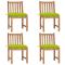 Chaises de jardin lot de 4 avec coussins Bois de teck massifCet ensemble de chaises de jardin en bois robuste sera un endroit idéal pour vous détendre et profiter du soleil dans votre jardin ou patio. Fabriquée en bois dur de teck extrêmement durable, cette pièce de meuble en teck a été chevronnée, séchée au four puis finement poncée pour lui donner un aspect très lisse. Le bois de teck est connu pour sa résistance exceptionnelle aux intempéries, ce qui le rend bien plus adapté aux meubles de jardin que tout autre type de bois. Le bois de teck est le choix idéal si vous souhaitez acheter un meuble de jardin durable. Une belle finition à base d'eau est appliquée pour donner au bois une couleur chaude. Les chaises d'extérieur stables disposent d'un aspect raffiné qui peut instantanément se fondre dans n'importe quel espace de vie. Le coussin inclus est pratique et a une fonction décorative. Remarque : Afin de prolonger la durée de vie de vos meubles d'extérieur, nous vous recommandons de les nettoyer régulièrement et de ne pas les laisser à l'extérieur sans protection inutilement. Nettoyage : Utiliser une solution savonneuse douce Stockage : Si possible, stockez dans un endroit frais et sec à l'intérieur. Si le produit est stocké à l'extérieur, protégez-le avec une housse imperméable. Essuyez et séchez l'excès d'eau ou de neige des surfaces planes après la pluie ou une chute de neige. Permettez une circulation d'air suffisante afin d'éviter les dommages liés à l'humidité. Maximum 110 kg par siège.