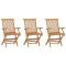 Chaises de jardin pliables lot de 3 Bois de teck massifCet ensemble de chaises de jardin, au design simple mais élégant, vous offre une expérience d'assise confortable. Construite à partir de bois dur de teck extrêmement durable, cette pièce de meuble en teck a été chevronnée, séchée au four puis poncée finement lui pour donner un aspect très lisse. Le bois de teck est connu pour sa solidité et sa résistance aux intempéries exceptionnelles, ce qui le rend bien plus adapté aux meubles de jardin que tout autre type de bois. Le bois de teck est le choix parfait si vous souhaitez acheter un meuble de jardin durable. De plus, les chaises en bois peuvent être facilement repliées lorsqu'elles ne sont pas utilisées. Remarque : afin de prolonger la durée de vie de vos meubles d'extérieur, nous vous recommandons de les nettoyer régulièrement et de ne pas les laisser à l'extérieur sans protection inutilement. Nettoyage : utiliser une solution savonneuse douce Stockage : si possible, stockez dans un endroit frais et sec à l'intérieur. Si le produit est stocké à l'extérieur, protégez-le avec une housse imperméable. Essuyez et séchez l'excès d'eau ou de neige des surfaces planes après la pluie ou une chute de neige. Permettez une circulation d'air suffisante afin d'éviter les dommages liés à l'humidité. Maximum 110 kg par siège. ,