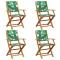 Chaises de jardin pliantes lot de 4 vert tissu et bois massifDétendez-vous et profitez de l'extérieur dans ces confortables chaises de jardin pliantes ! Robuste et stable : le bois d'acacia massif est connu pour sa solidité et sa durabilité. Ses couleurs variées et ses grains uniques lui confèrent un aspect attrayant. Sa stabilité et sa résistance aux intempéries en font un matériau idéal pour la fabrication de meubles d'intérieur et d'extérieur. Facile à transporter et à ranger : la chaise peut être facilement pliée lorsqu'elle n'est pas utilisée, pour un rangement et un transport faciles. Conception pratique : la main courante en bois, pratique et plate, vous permet de poser vos mains dessus tout en profitant d'un moment en plein air. Diverses utilisations : la chaise pliable a un large éventail d'utilisations et peut facilement répondre à vos besoins dans n'importe quel environnement extérieur, comme les jardins, les patios, les balcons, etc. Bon à savoir : Pour que vos meubles d'extérieur restent beaux, nous vous recommandons de les protéger avec une housse imperméable. Maximum 110 kg par siège. ,