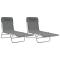 Chaises longues pliables lot de 2 gris textilène et acierDétendez-vous sur ces chaises longues pliantes dans votre jardin ou n'importe quel espace de vie extérieur ! Matériau durable : le tissu en textilène permet à l'air de circuler librement à travers lui tout en étant résistant aux rayons UV. Le textilène est donc idéal pour les temps chauds. En tant que matériau durable et solide, il est très résistant aux déchirures, aux perforations et aux moisissures. Cadre stable : le cadre en acier enduit de poudre rend le transat robuste et stable. Expérience confortable : les deux côtés de la chaise longue peuvent être relevés et le dossier est réglable pour une assise et une position allongée confortables. Fonction pliable : la chaise longue peut être pliée en un format compact pour faciliter le rangement et le transport. La poignée latérale intégrée facilite le transport. Remarque : Pour que vos meubles d'extérieur restent beaux, nous vous recommandons de les protéger avec une housse imperméable. Maximum 110 kg par siège. Soyez conscient du risque de feux ouverts et d'autres sources de forte chaleur à proximité du produit. ,