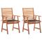 Chaises à manger d'extérieur lot de 2 et coussins Acacia massifCet ensemble de chaises de salle à manger contemporain en bois avec coussins ajoutera une touche de style naturel à votre jardin, terrasse ou patio. Cet ensemble de chaises en bois sera un excellent choix pour les repas en plein air. Ces chaises de jardin sont fabriquées en bois d'acacia massif, un bois dur tropical, résistant aux intempéries et durable pendant des années. La surface finie à l'huile est facile à nettoyer avec un chiffon humide. La conception à lattes apportera un charme rustique. De plus, les coussins inclus offrent du confort supplémentaire lors de l'assise. Il est composé à 100 % de polyester qui a été traité pour le rendre imperméable. Chaque coussin a deux jeux de cordes pour le fixer fermement sur la chaise. Maximum 110 kg par siège.