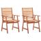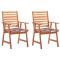 Chaises à manger d'extérieur lot de 2 et coussins Acacia massifCet ensemble de chaises de salle à manger contemporain en bois avec coussins ajoutera une touche de style naturel à votre jardin, terrasse ou patio. Cet ensemble de chaises en bois sera un excellent choix pour les repas en plein air. Ces chaises de jardin sont fabriquées en bois d'acacia massif, un bois dur tropical, résistant aux intempéries et durable pendant des années. La surface finie à l'huile est facile à nettoyer avec un chiffon humide. La conception à lattes apportera un charme rustique. De plus, les coussins inclus offrent du confort supplémentaire lors de l'assise. Il est composé à 100 % de polyester qui a été traité pour le rendre imperméable. Chaque coussin a deux jeux de cordes pour le fixer fermement sur la chaise. Maximum 110 kg par siège.