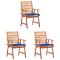 Chaises à manger d'extérieur lot de 3 et coussins Acacia massifCet ensemble de chaises de salle à manger contemporain en bois avec coussins ajoutera une touche de style naturel à votre jardin, terrasse ou patio. Cet ensemble de chaises en bois sera un excellent choix pour les repas en plein air. Ces chaises de jardin sont fabriquées en bois d'acacia massif, un bois dur tropical, résistant aux intempéries et durable pendant des années. La surface finie à l'huile est facile à nettoyer avec un chiffon humide. La conception à lattes apportera un charme rustique. De plus, les coussins inclus offrent du confort supplémentaire lors de l'assise. Il est composé à 100 % de polyester qui a été traité pour le rendre imperméable. Chaque coussin a deux jeux de cordes pour le fixer fermement sur la chaise. Maximum 110 kg par siège.