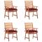 Chaises à manger d'extérieur lot de 4 et coussins Acacia massifCet ensemble de chaises de salle à manger contemporain en bois avec coussins ajoutera une touche de style naturel à votre jardin, terrasse ou patio. Cet ensemble de chaises en bois sera un excellent choix pour les repas en plein air. Ces chaises de jardin sont fabriquées en bois d'acacia massif, un bois dur tropical, résistant aux intempéries et durable pendant des années. La surface finie à l'huile est facile à nettoyer avec un chiffon humide. La conception à lattes apportera un charme rustique. De plus, les coussins inclus offrent du confort supplémentaire lors de l'assise. Il est composé à 100 % de polyester qui a été traité pour le rendre imperméable. Chaque coussin a deux jeux de cordes pour le fixer fermement sur la chaise. Remarque : Afin de prolonger la durée de vie de vos meubles d'extérieur, nous vous recommandons de les nettoyer régulièrement et de ne pas les laisser à l'extérieur sans protection inutilement.Nettoyage : Utiliser une solution savonneuse douceStockage : Si possible, stockez dans un endroit frais et sec à l'intérieur. Si le produit est stocké à l'extérieur, protégez-le avec une housse imperméable. Essuyez et séchez l'excès d'eau ou de neige des surfaces planes après la pluie ou une chute de neige. Permettez une circulation d'air suffisante afin d'éviter les dommages liés à l'humidité. Maximum 110 kg par siège.