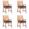Chaises à manger d'extérieur lot de 4 et coussins Acacia massifCet ensemble de chaises de salle à manger contemporain en bois avec coussins ajoutera une touche de style naturel à votre jardin, terrasse ou patio. Cet ensemble de chaises en bois sera un excellent choix pour les repas en plein air. Ces chaises de jardin sont fabriquées en bois d'acacia massif, un bois dur tropical, résistant aux intempéries et durable pendant des années. La surface finie à l'huile est facile à nettoyer avec un chiffon humide. La conception à lattes apportera un charme rustique. De plus, les coussins inclus offrent du confort supplémentaire lors de l'assise. Il est composé à 100 % de polyester qui a été traité pour le rendre imperméable. Chaque coussin a deux jeux de cordes pour le fixer fermement sur la chaise. Remarque : Afin de prolonger la durée de vie de vos meubles d'extérieur, nous vous recommandons de les nettoyer régulièrement et de ne pas les laisser à l'extérieur sans protection inutilement.Nettoyage : Utiliser une solution savonneuse douceStockage : Si possible, stockez dans un endroit frais et sec à l'intérieur. Si le produit est stocké à l'extérieur, protégez-le avec une housse imperméable. Essuyez et séchez l'excès d'eau ou de neige des surfaces planes après la pluie ou une chute de neige. Permettez une circulation d'air suffisante afin d'éviter les dommages liés à l'humidité. Maximum 110 kg par siège.