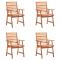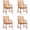 Chaises à manger d'extérieur lot de 4 et coussins Acacia massifCet ensemble de chaises de salle à manger contemporain en bois avec coussins ajoutera une touche de style naturel à votre jardin, terrasse ou patio. Cet ensemble de chaises en bois sera un excellent choix pour les repas en plein air. Ces chaises de jardin sont fabriquées en bois d'acacia massif, un bois dur tropical, résistant aux intempéries et durable pendant des années. La surface finie à l'huile est facile à nettoyer avec un chiffon humide. La conception à lattes apportera un charme rustique. De plus, les coussins inclus offrent du confort supplémentaire lors de l'assise. Il est composé à 100 % de polyester qui a été traité pour le rendre imperméable. Chaque coussin a deux jeux de cordes pour le fixer fermement sur la chaise. Remarque : Afin de prolonger la durée de vie de vos meubles d'extérieur, nous vous recommandons de les nettoyer régulièrement et de ne pas les laisser à l'extérieur sans protection inutilement.Nettoyage : Utiliser une solution savonneuse douceStockage : Si possible, stockez dans un endroit frais et sec à l'intérieur. Si le produit est stocké à l'extérieur, protégez-le avec une housse imperméable. Essuyez et séchez l'excès d'eau ou de neige des surfaces planes après la pluie ou une chute de neige. Permettez une circulation d'air suffisante afin d'éviter les dommages liés à l'humidité. Maximum 110 kg par siège.