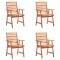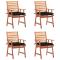 Chaises à manger d'extérieur lot de 4 et coussins Acacia massifCet ensemble de chaises de salle à manger contemporain en bois avec coussins ajoutera une touche de style naturel à votre jardin, terrasse ou patio. Cet ensemble de chaises en bois sera un excellent choix pour les repas en plein air. Ces chaises de jardin sont fabriquées en bois d'acacia massif, un bois dur tropical, résistant aux intempéries et durable pendant des années. La surface finie à l'huile est facile à nettoyer avec un chiffon humide. La conception à lattes apportera un charme rustique. De plus, les coussins inclus offrent du confort supplémentaire lors de l'assise. Il est composé à 100 % de polyester qui a été traité pour le rendre imperméable. Chaque coussin a deux jeux de cordes pour le fixer fermement sur la chaise. Remarque : Afin de prolonger la durée de vie de vos meubles d'extérieur, nous vous recommandons de les nettoyer régulièrement et de ne pas les laisser à l'extérieur sans protection inutilement.Nettoyage : Utiliser une solution savonneuse douceStockage : Si possible, stockez dans un endroit frais et sec à l'intérieur. Si le produit est stocké à l'extérieur, protégez-le avec une housse imperméable. Essuyez et séchez l'excès d'eau ou de neige des surfaces planes après la pluie ou une chute de neige. Permettez une circulation d'air suffisante afin d'éviter les dommages liés à l'humidité. Maximum 110 kg par siège.