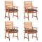 Chaises à manger d'extérieur lot de 4 et coussins Acacia massifCet ensemble de chaises de salle à manger contemporain en bois avec coussins ajoutera une touche de style naturel à votre jardin, terrasse ou patio. Cet ensemble de chaises en bois sera un excellent choix pour les repas en plein air. Ces chaises de jardin sont fabriquées en bois d'acacia massif, un bois dur tropical, résistant aux intempéries et durable pendant des années. La surface finie à l'huile est facile à nettoyer avec un chiffon humide. La conception à lattes apportera un charme rustique. De plus, les coussins inclus offrent du confort supplémentaire lors de l'assise. Il est composé à 100 % de polyester qui a été traité pour le rendre imperméable. Chaque coussin a deux jeux de cordes pour le fixer fermement sur la chaise. Remarque : Afin de prolonger la durée de vie de vos meubles d'extérieur, nous vous recommandons de les nettoyer régulièrement et de ne pas les laisser à l'extérieur sans protection inutilement.Nettoyage : Utiliser une solution savonneuse douceStockage : Si possible, stockez dans un endroit frais et sec à l'intérieur. Si le produit est stocké à l'extérieur, protégez-le avec une housse imperméable. Essuyez et séchez l'excès d'eau ou de neige des surfaces planes après la pluie ou une chute de neige. Permettez une circulation d'air suffisante afin d'éviter les dommages liés à l'humidité. Maximum 110 kg par siège.